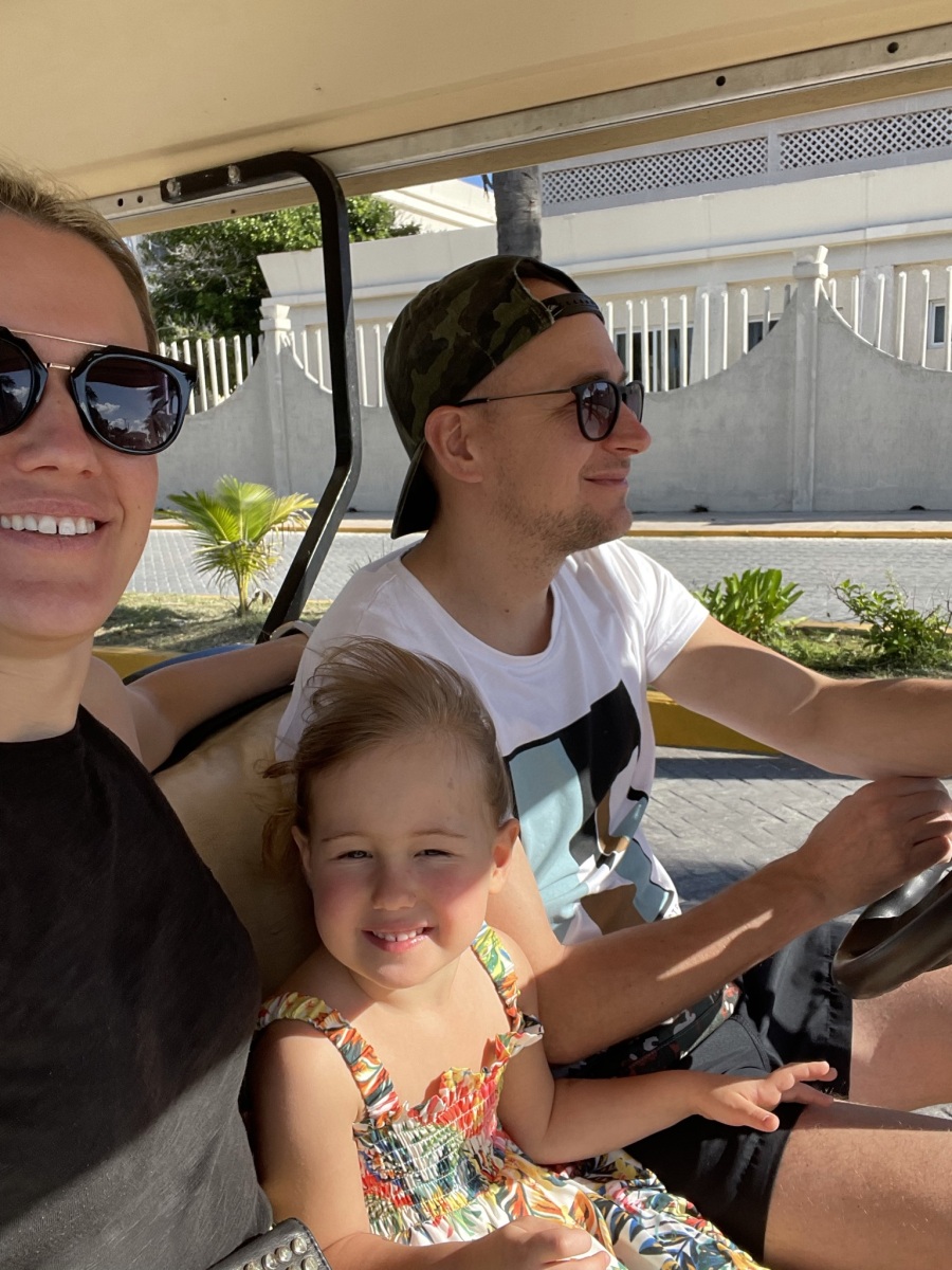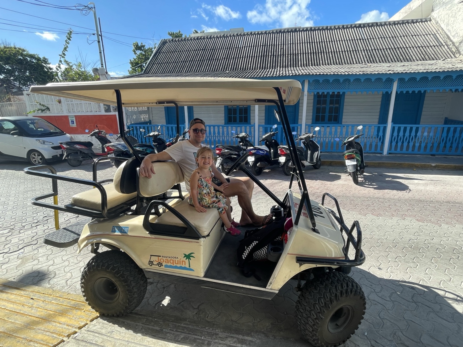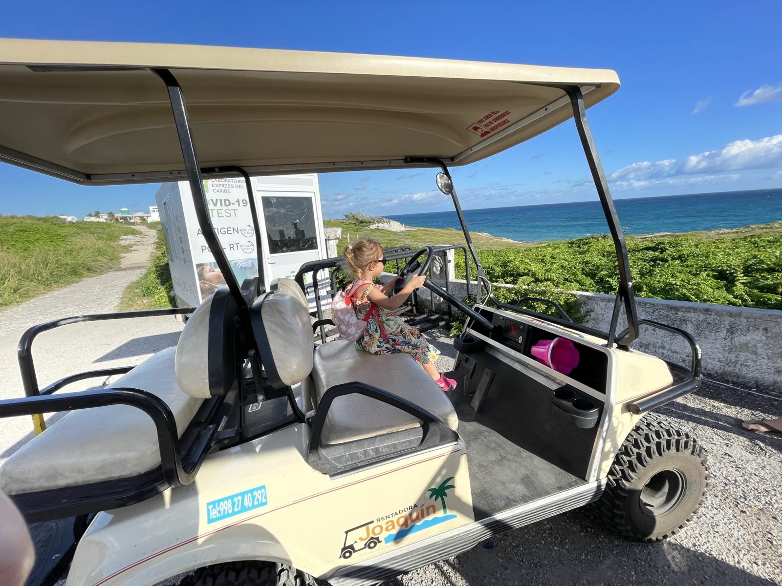 Kuna Isla Mujeres on küllalti pisike ja kiitsakas saar, siis autosid siin meeletult ringi ei liigu. Kohalikud sõidavad peamiselt rollerite ja autodega ja turistid peamiselt golfiautoga. Erinevas suuruses golfiautod on siis enamus linnapildis olevatest liiklusvahenditest. Nad on küll küllaltki lärmakad aga siiski neljal rattal ja veidike turvalisemad kui roller. Rent 2h on 600 pesot, 8h 950 pesot ja 24h oli vist 1200 pesot. Hotelli omanikul on oma rendifirma siis saime veidi soodukat  ja võtsime 8h tunniks (maksime 33 €), et saarele korralik tiir peale teha.